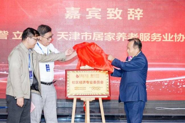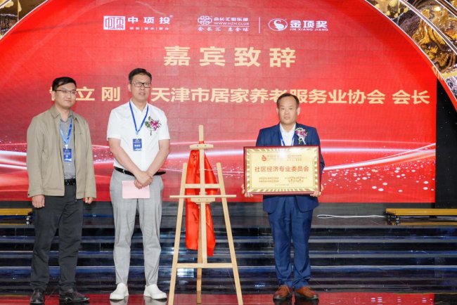 会长汇俱乐部社区经济专业委员会同步揭牌成立,天津市居家养老服务业协会会长訾立刚、天津市社区养老服务业协会会长何伟共同为专委会揭牌。